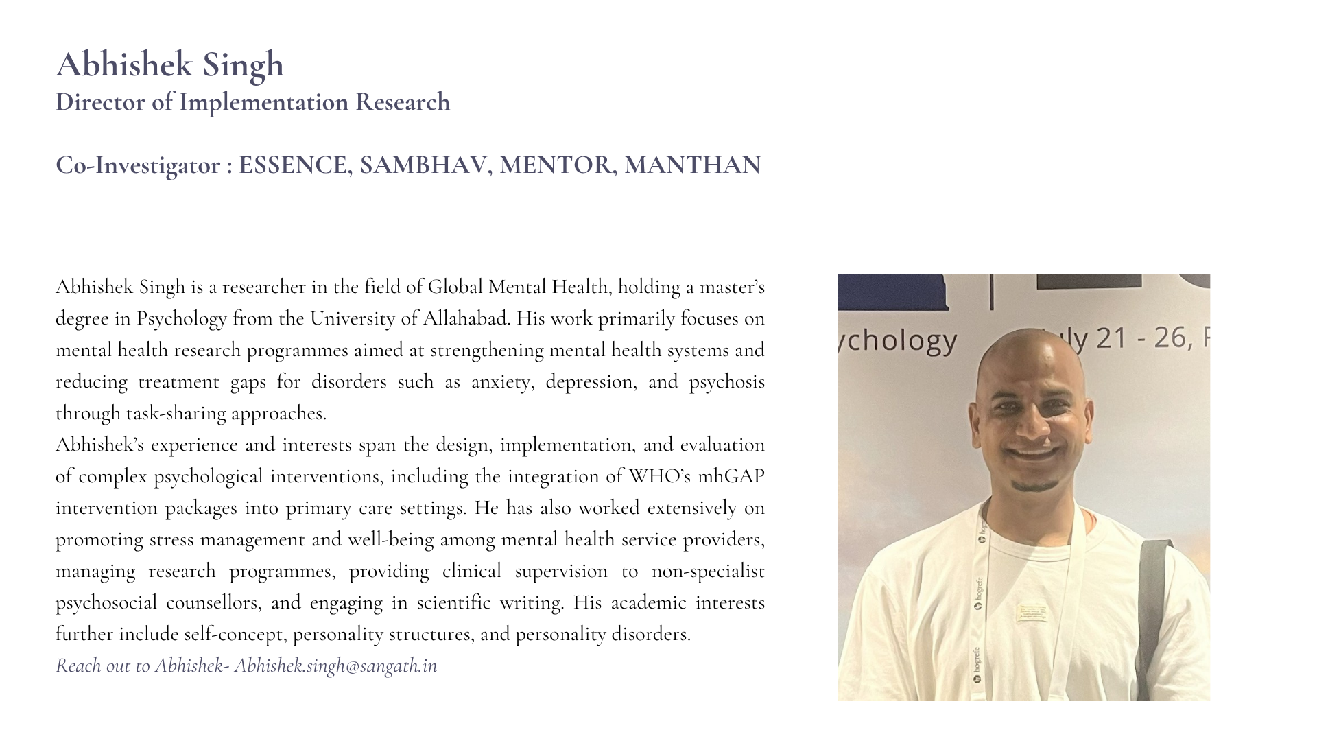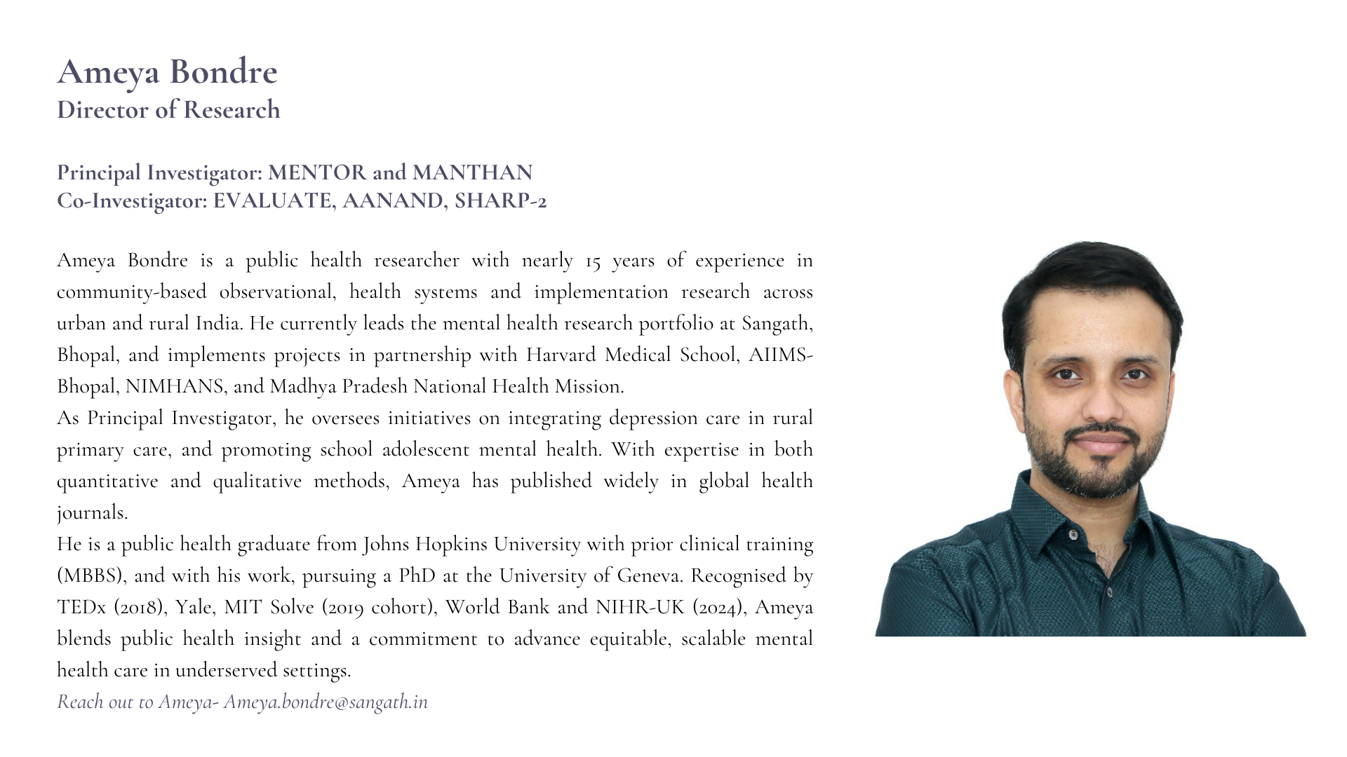 The project will be implemented in government schools of Bhopal during 2025-2027. We aim to reduce the incidence of symptoms of depression, anxiety and suicidal ideation in 13-17-year-old students in urban Bhopal, through a combination of-